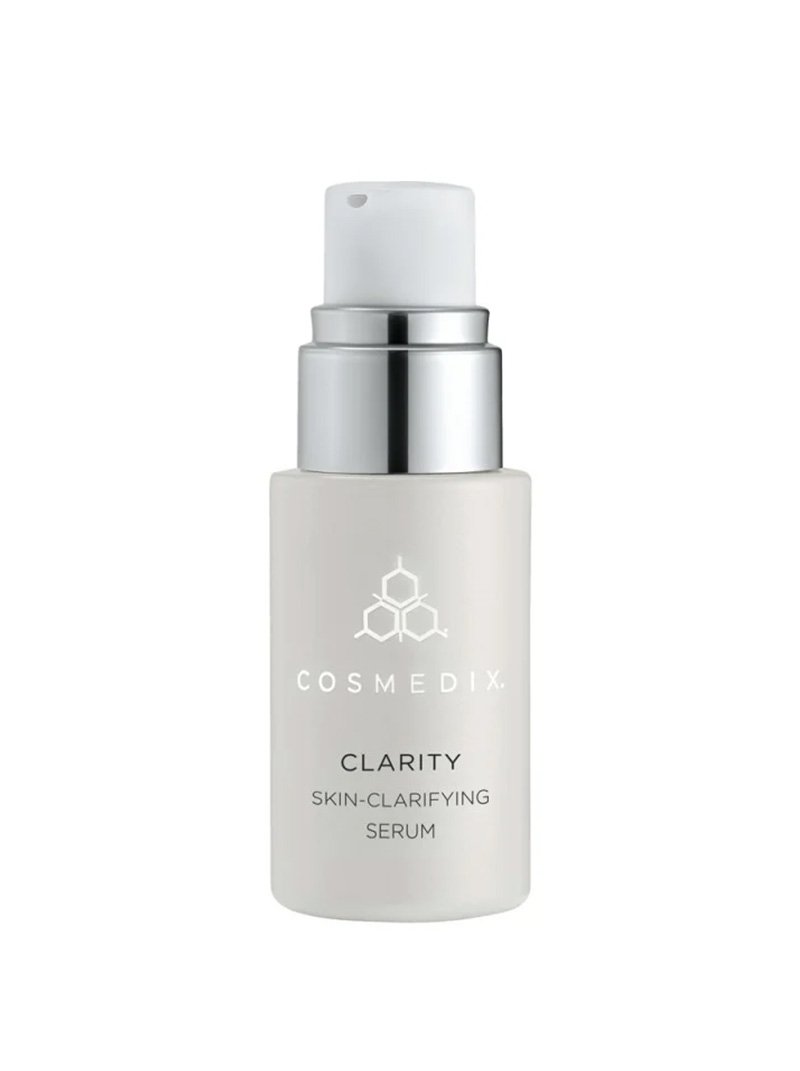 Cosmedix Clarity Skin-Clarifying to serum oczyszczające. Receptura produktu oparta jest na retinolu 0,12%, kwasie salicylowym i niacynamidzie, które działając razem, mogą delikatnie złuszczać naskórek. Dodatkowo odblokowują zatkane pory i niwelują stany zapalne. Ekstrakt z ruszczyka, olejki z drzewa herbacianego i rozmarynu działają silnie antybakteryjnie, a aloes pomaga złagodzić podrażnienia.
