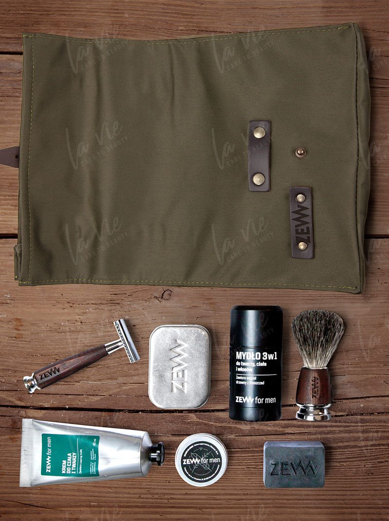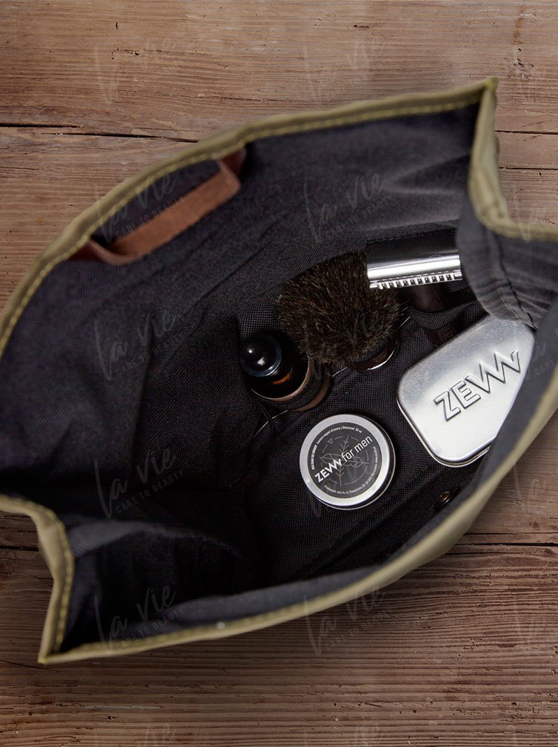 Elastyczny materiał jest lżejszy niż w przypadku lnianej kosmetyczki ZEW for men, co sprawia, że wersję bawełnianą kosmetyczki łatwiej zwinąć i schować do niedużego bagażu.